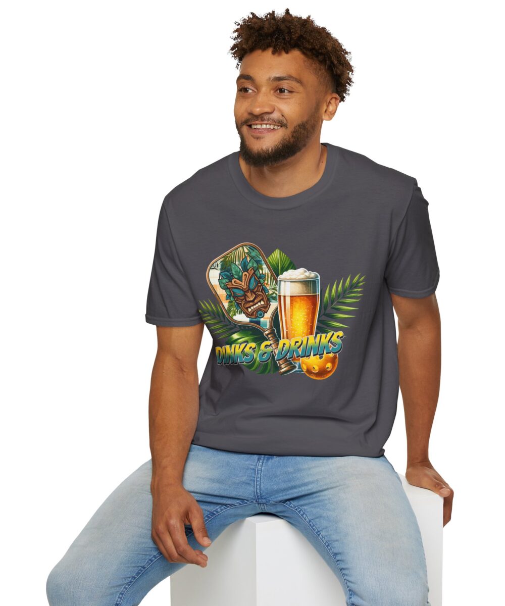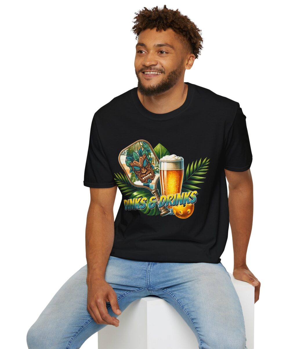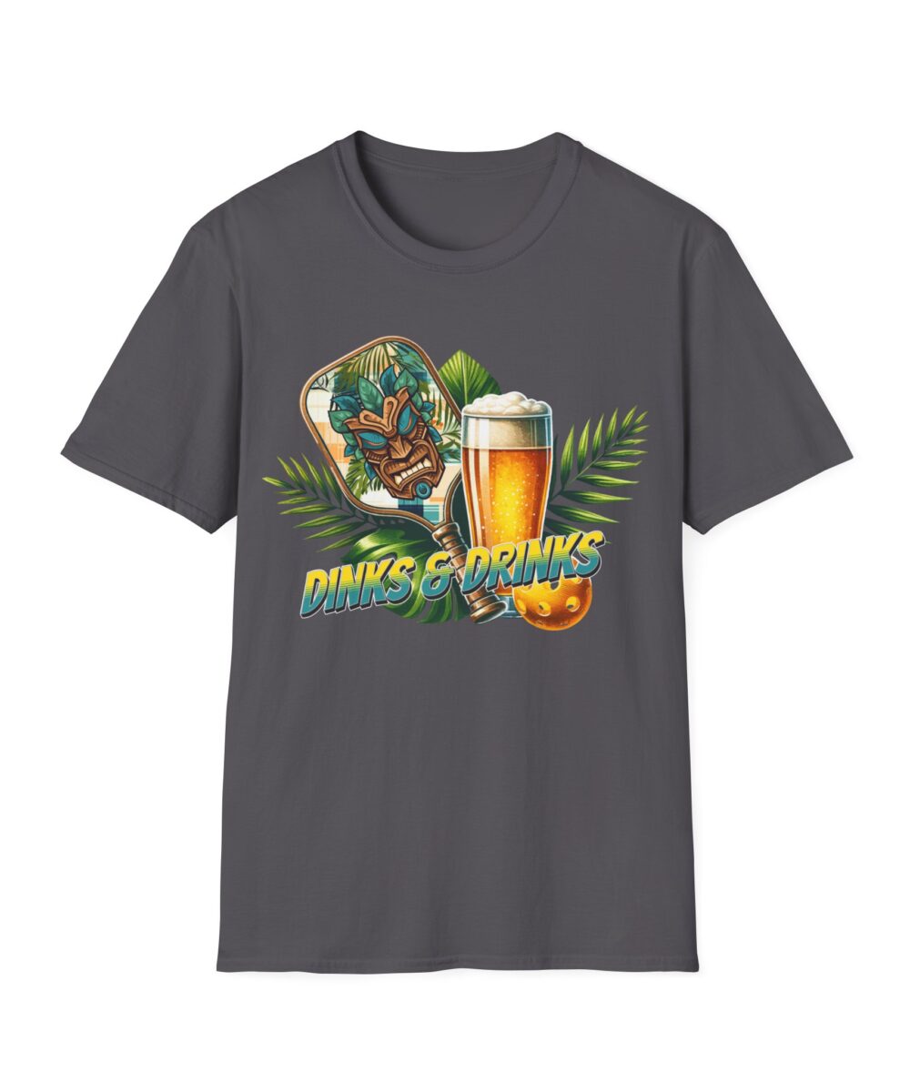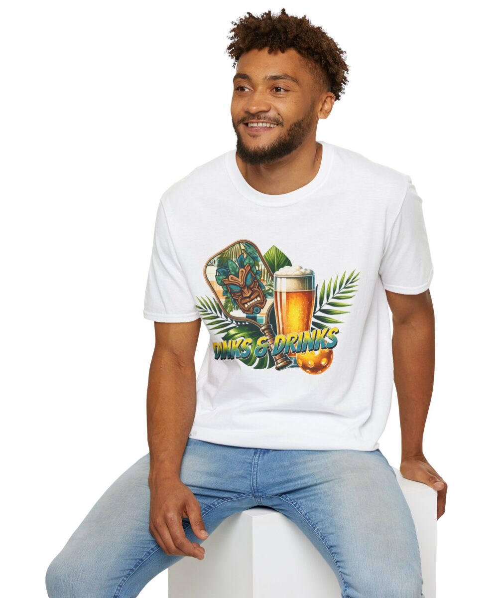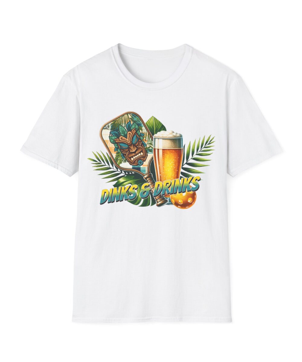 Level up your pickleball style with this awesome “Dinks & Drinks” tee! Featuring a cool tiki-inspired paddle, a refreshing brew, and vibrant tropical vibes, this shirt is the perfect addition to your favorite pickleball wear for both on and off the court.